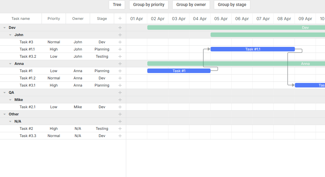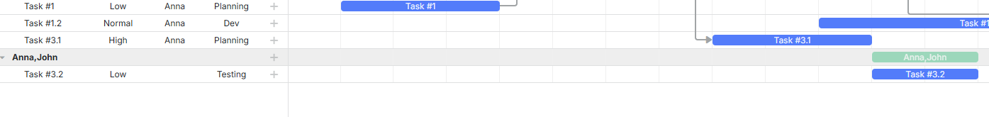 However, a task here might have multiple users. For example, in the diagram, Task #1.1 has both John and Anna as owners. Therefore, when grouping by owner, John and Anna each have their own Task #1.1, instead of John and Anna as a group. as shown in the image below.